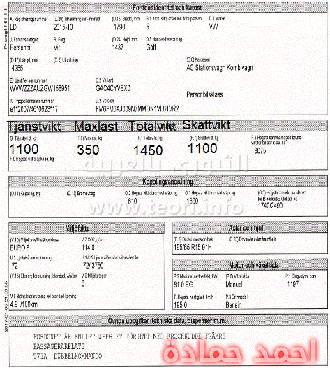 يحق لك أن تقود سيارتك حسب السجل المدون أمامك في الصورة ,لا يوجد لديك ركاب ,ماذا يصبح وزن السيارة بعد أن وضعت فيها 200 كلغ؟